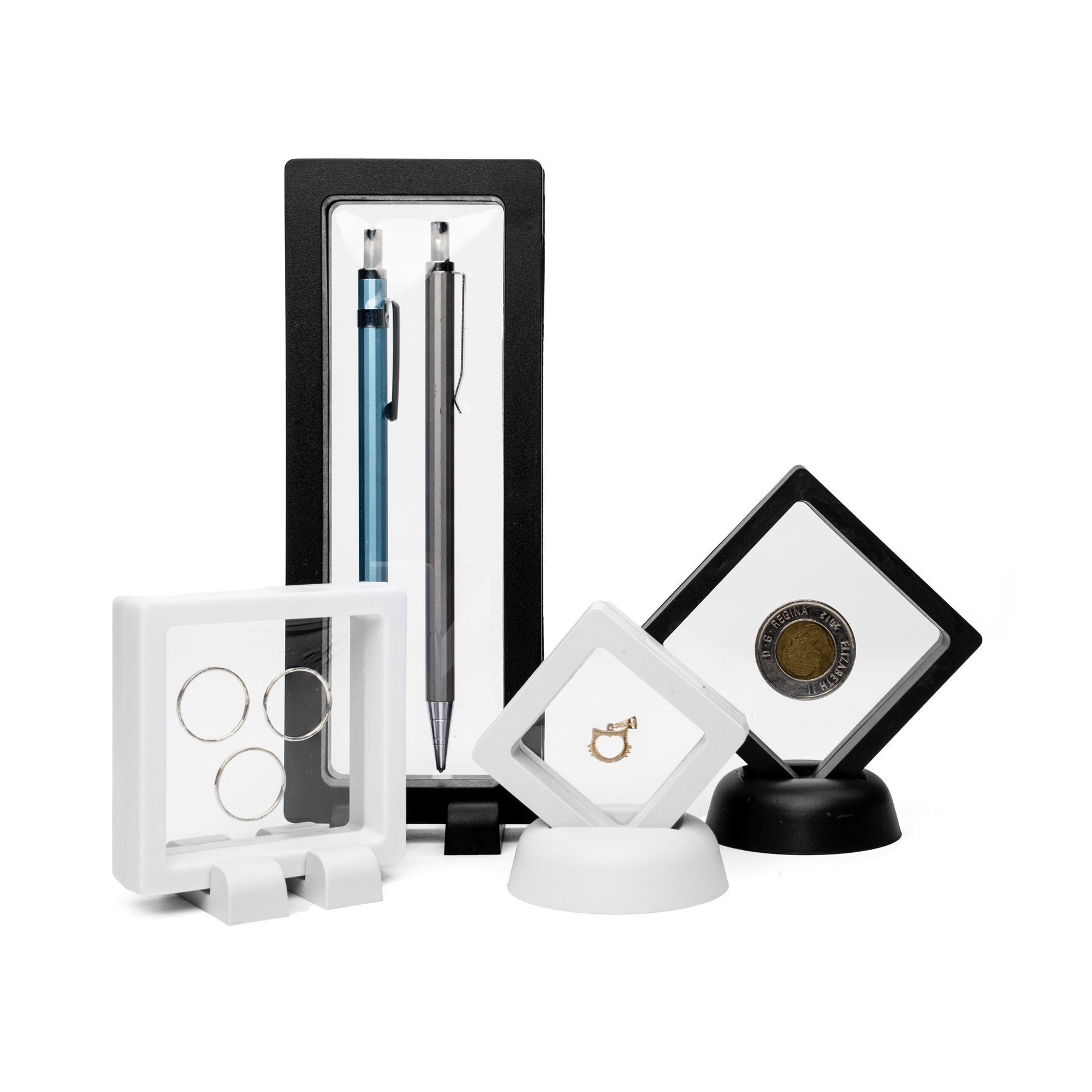 Der Kunststoffrahmen ist aufklappbar und besteht aus zwei festen Hälften, an denen jeweils eine flexible, transparente Silikonmembran angebracht ist . Nach dem Öffnen legen Sie den Gegenstand hinein und schließen den Rahmen. Die Membranen verschmelzen miteinander, schmiegen sich sanft an das Objekt und halten es fest an seinem Platz. Aufgrund ihrer extremen Elastizität können sie sich bis auf etwa 2 bis 3 Zentimeter dehnen, so dass sie problemlos größere oder sperrige Gegenstände aufnehmen können. Der "Schwebeeffekt" und die volle Sichtbarkeit von allen Seiten bleiben dabei erhalten.