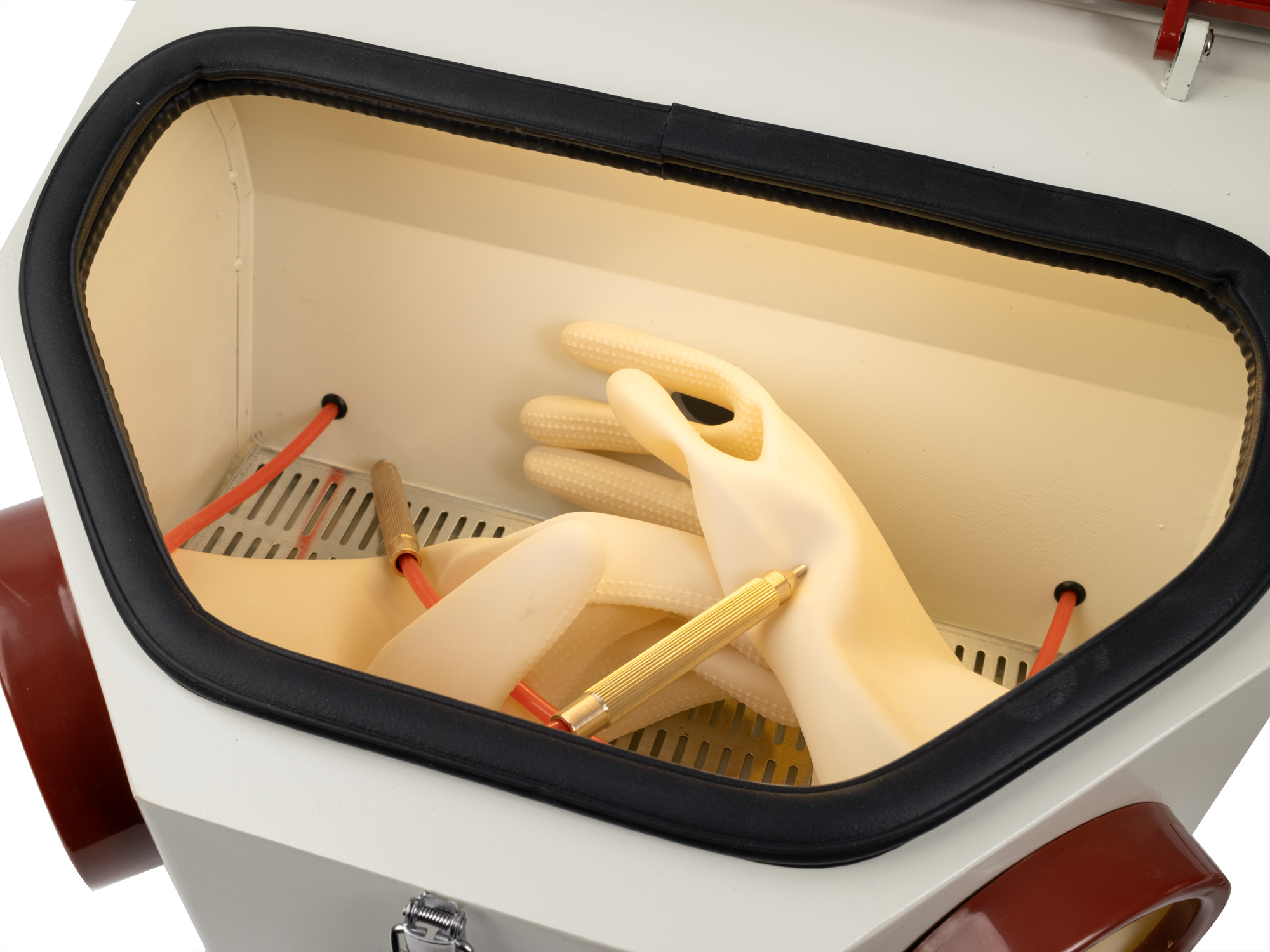 Der Hauptvorteil dieses Gerätetyps ist der geschlossene Arbeitsbereich, der einen sauberen und sicheren Betrieb gewährleistet. Das gesamte Schleifmittel verbleibt im Inneren des Kastens, so dass es nicht in die Umgebung spritzt und der Bediener keinem Feinstaub ausgesetzt ist. Dies macht die Arbeit nicht nur hygienischer, sondern auch wesentlich präziser. Ein großer praktischer Vorteil sind die zwei getrennten Stifte und zwei Strahlmitteltanks, die es ermöglichen, z. B. feine und gröbere Medien gleichzeitig bereitzuhalten und sofort zwischen ihnen zu wechseln, ohne das System entleeren oder reinigen zu müssen. Das macht die Arbeit reibungslos und effizient.