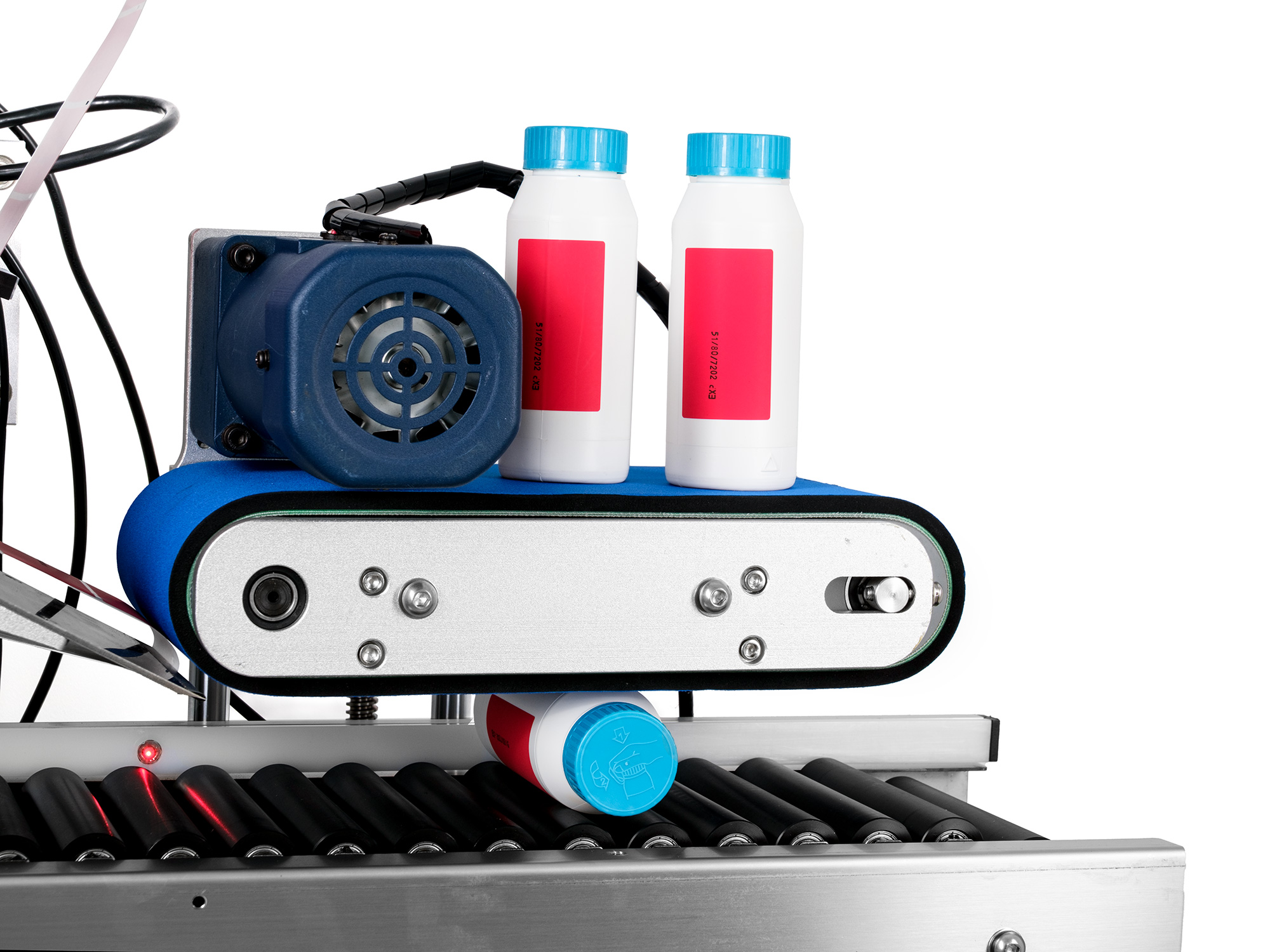 Die Arbeit mit der Maschine ist einfach und schnell. Der Bediener setzt die vorbereiteten Flaschen oben auf die Maschine, wo sie gleichmäßig über die angetriebene Rollenbahn laufen. Diese führt sie unter den Etikettierkopf, der das Etikett von der Rolle mit den selbstklebenden Etiketten ablöst und auf die Flaschenoberfläche drückt.