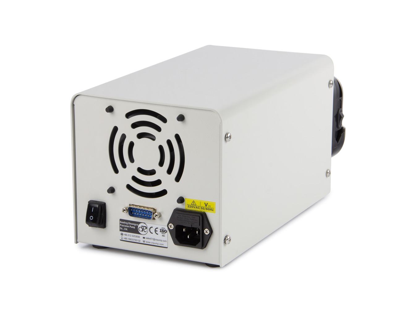 Die Pumpe ist sehr hochwertig verarbeitet, das Chassis besteht aus dickem, mattem Edelstahl (304 Edelstahl), der Pumpenkopf YZ35-13 ist aus Aluminium (bewegliche Teile) und PPS (Gehäusekopf) gefertigt. Auf der Rückseite der Pumpe befindet sich ein aktiver Lüfter, der immer läuft, ein wasserdichter Schalter und ein 15PIN D-SUB-Anschluss, an den entweder ein Pedal angeschlossen werden kann oder über den die Pumpe über RS232, RS485 mit MODBUS-Unterstützung ferngesteuert werden kann.