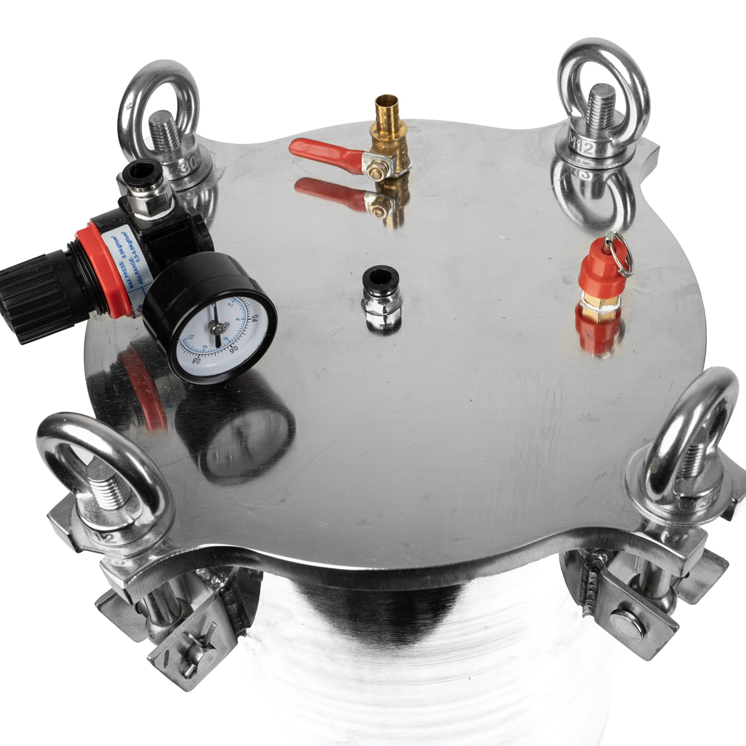 Der Schnellverschlussflansch am Ein- und Auslass des Druckbehälters ist mit John Guest 5/16"-Anschlusssystemen und europäischen 8-mm-Rohrleitungen kompatibel. Ein Schlauch kann durch die Auslassöffnung geschoben und die Schlauchmündung auf den Boden des Druckbehälters gesenkt werden. Der Druckbehälter ist mit einem Überdruckventil, einem Manometer und einem Druckregler ausgestattet. Der dichte Verschluss wird durch 4 stabile Schrauben gewährleistet, die den Deckel fest in Position halten. Das Öffnen des Behälters ist weder kompliziert noch zeitaufwändig, es genügt, die Schrauben leicht zu lösen und den Deckel abzuschieben. Der Behälter ist hermetisch verschlossen, was eine Verdunstung der abgegebenen Stoffe und deren Verunreinigung verhindert.
