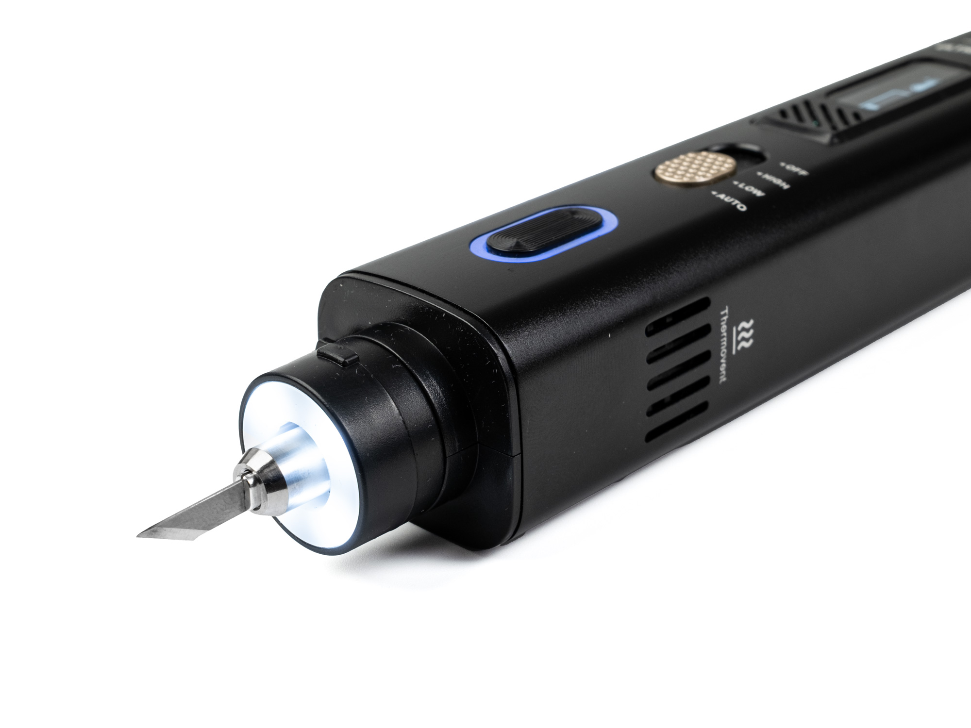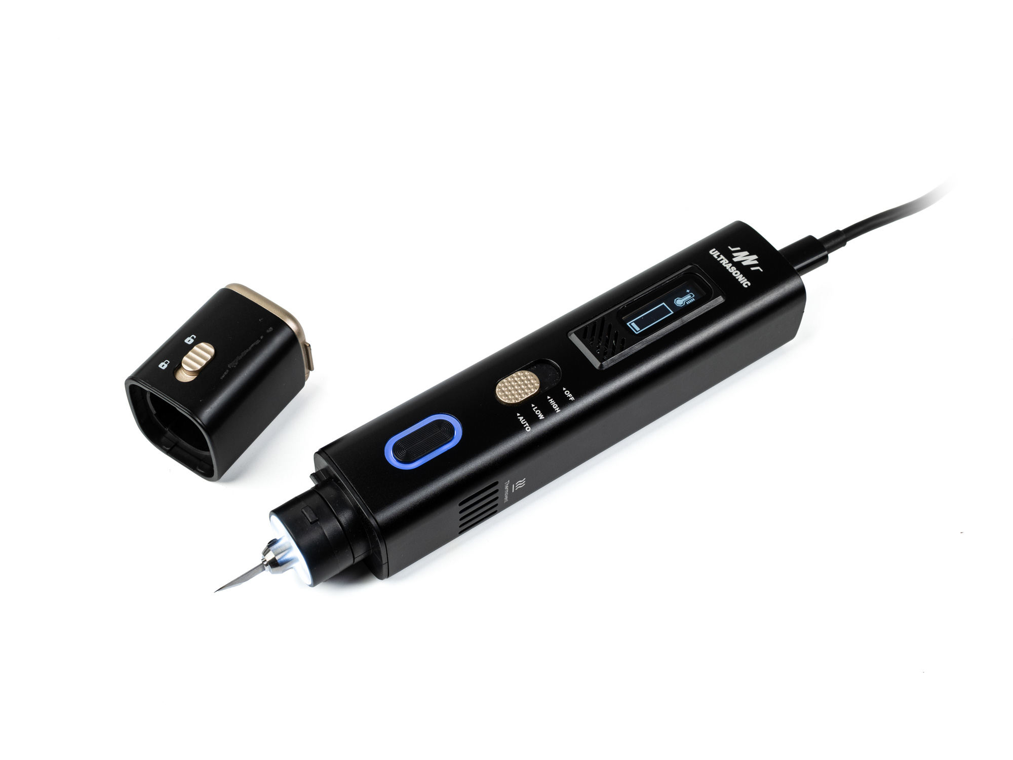 Das Messer verfügt über drei Leistungsmodi - AUTO, LOW und HIGH-, mit denen Sie die ideale Ultraschallstärke für Ihren spezifischen Materialtyp auswählen können. Im AUTO-Modus wird der Ultraschall bei Kontakt mit dem Material automatisch aktiviert, was einen reibungslosen Betrieb ermöglicht und die Erwärmung des Werkzeugs reduziert. LOW ist für feine Schnitte, die Präzisionsbearbeitung weicher Materialien und 3D-Drucke geeignet. HIGH hingegen bietet maximale Leistung für das schnelle Schneiden von härteren Kunststoffen, Silikon, Gummi oder mehrschichtigen Materialien, bei denen ein höherer Durchsatz und eine höhere Schneidleistung erforderlich sind.