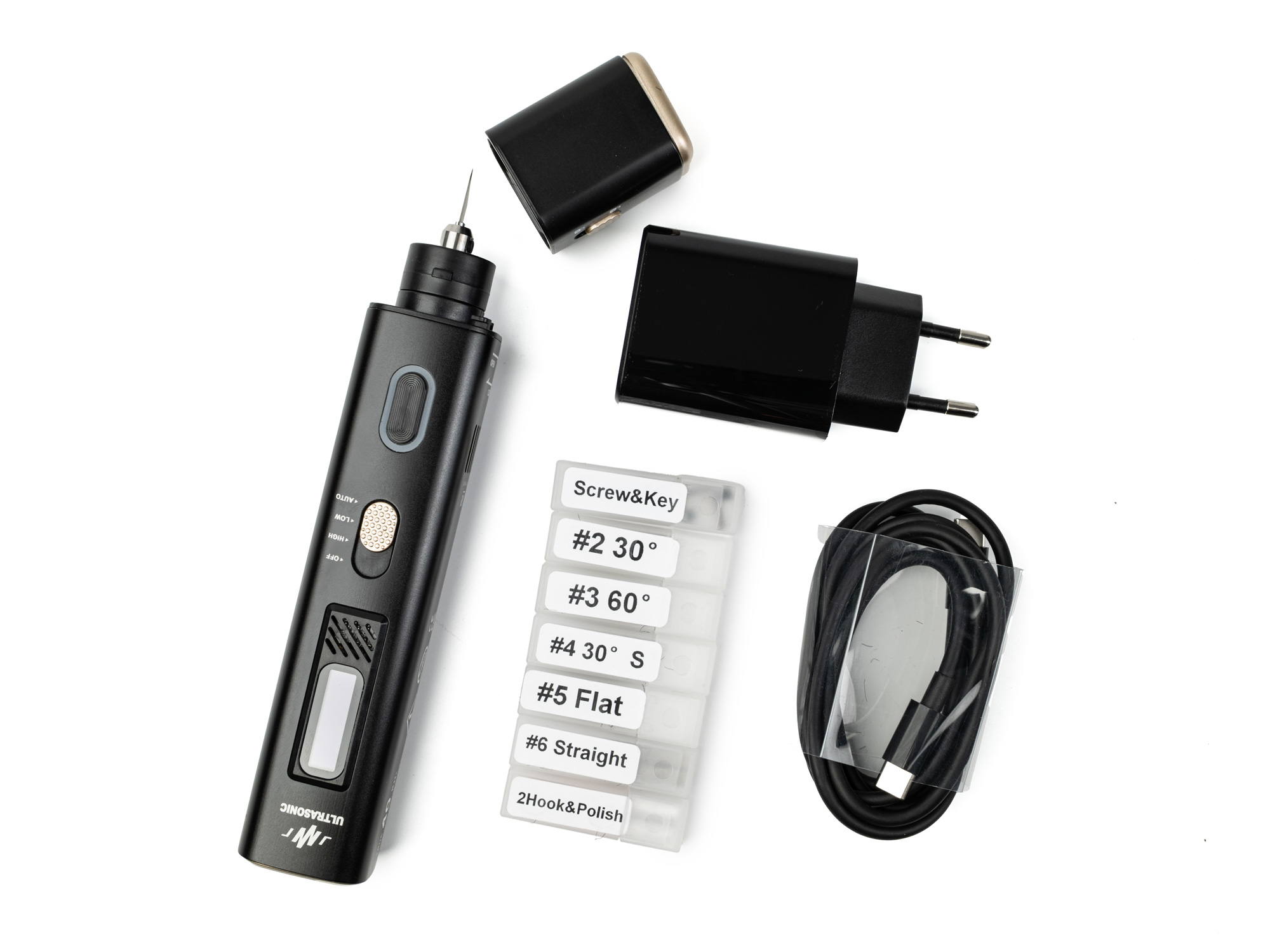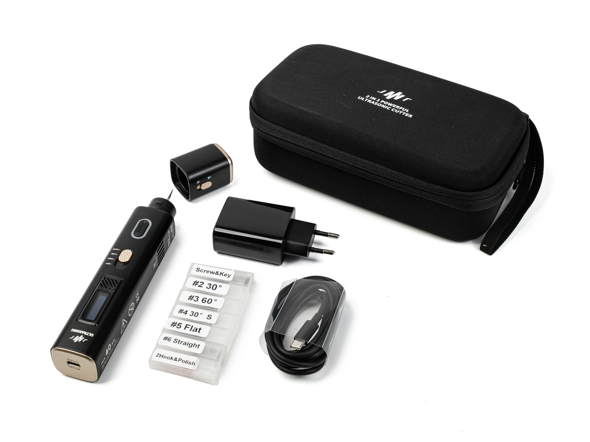 Ultrasonic Knife 2in1, USB-C Power Adapter, 30W, USB-C Kabel 1,5m, Klingen: 10x 4mm Fase 60°, 10x 4mm Fase 30°, 10x 2mm Fase 30°, 10x 2mm gerade, 10x 20mm flach, 1x Polieraufsatz, 1x Poliermesserzange. 2x Zange für die Klinge, 2x Inbusschlüssel, 5x Ersatzschnecke zum Fixieren der Klinge, Etui mit Reißverschluss.